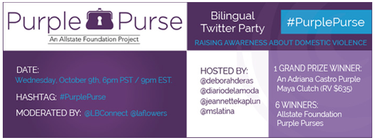 También te invito a que participes en una fiesta bilingüe virtual en Twitter, el día 9 de Octubre a las 6pm / 9pm EST. Usa #PurplePurse para poder conversar con nosotros sobre lo importante que es el tema de la Violencia Doméstica. ¡Habrá premios!