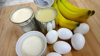 Ahora en la licuadora vas a poner los plátanos, leche condensada, leche evaporada y huevos. Muele todo hasta que todo quede bien mezclado.
