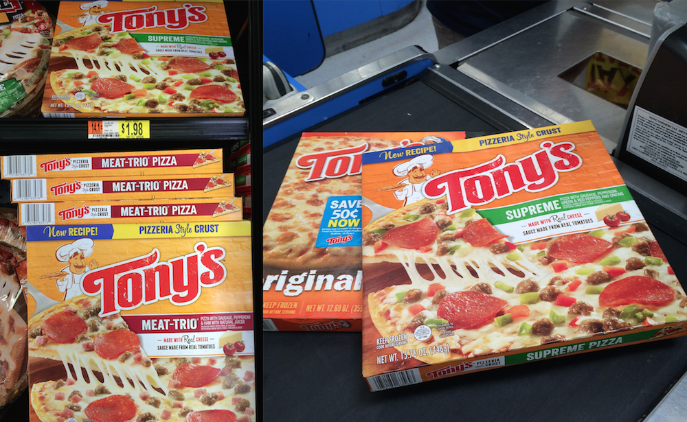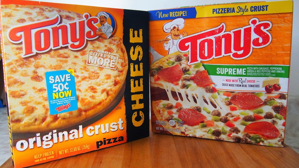 Hay muchas opciones, y creéme que en casa no cualquier pizza congelada nos gusta, así que me puse a buscar una buena opción. En la esquina del congelador vi Tony’s Pizza, y supe que esa era la mejor opción. Tony’s Pizzahace sus pizzas de queso real y la salsa está hecha de jitomates, no como muchas otras que todos los ingredientes son artificiales. Asi que compre dos: Una de Supreme y una de Queso.