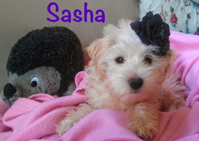 Luego Sasha (mix maltés), ella tiene casi 3 años, y es la mimada de la familia. Cuando cumplió como año y medio, descubrimos que se estaba quedando ciega, y el veterinario la diagnosticó con Cataratas Juveniles. Ahora ella ya no mira, y la única manera de regresarle la vista sería una cirugía pero es muy costosa. Pero aunque al principio le afectó y cambió su comportamiento, ahora es una perrita normal, se la pasa jugando con sus juguetes, corre por toda la casa y se encarga de sacar de quicio a sus hermanas. Aunque no puede ver, ella sabe los espacios de la casa, mientras yo no mueva muebles todo está bien. A Sasha le encantan los huesos y el mango.