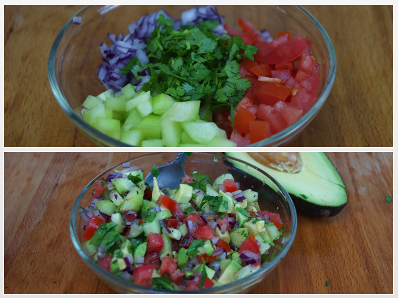 Pica en pedazos pequeños la cebolla, jitomate, pepino, aguacate y cilantro. Mezcla todo bien y agrégale un poquito de aceite de oliva y vinagre balsámico. Sazona con sal y pimienta.