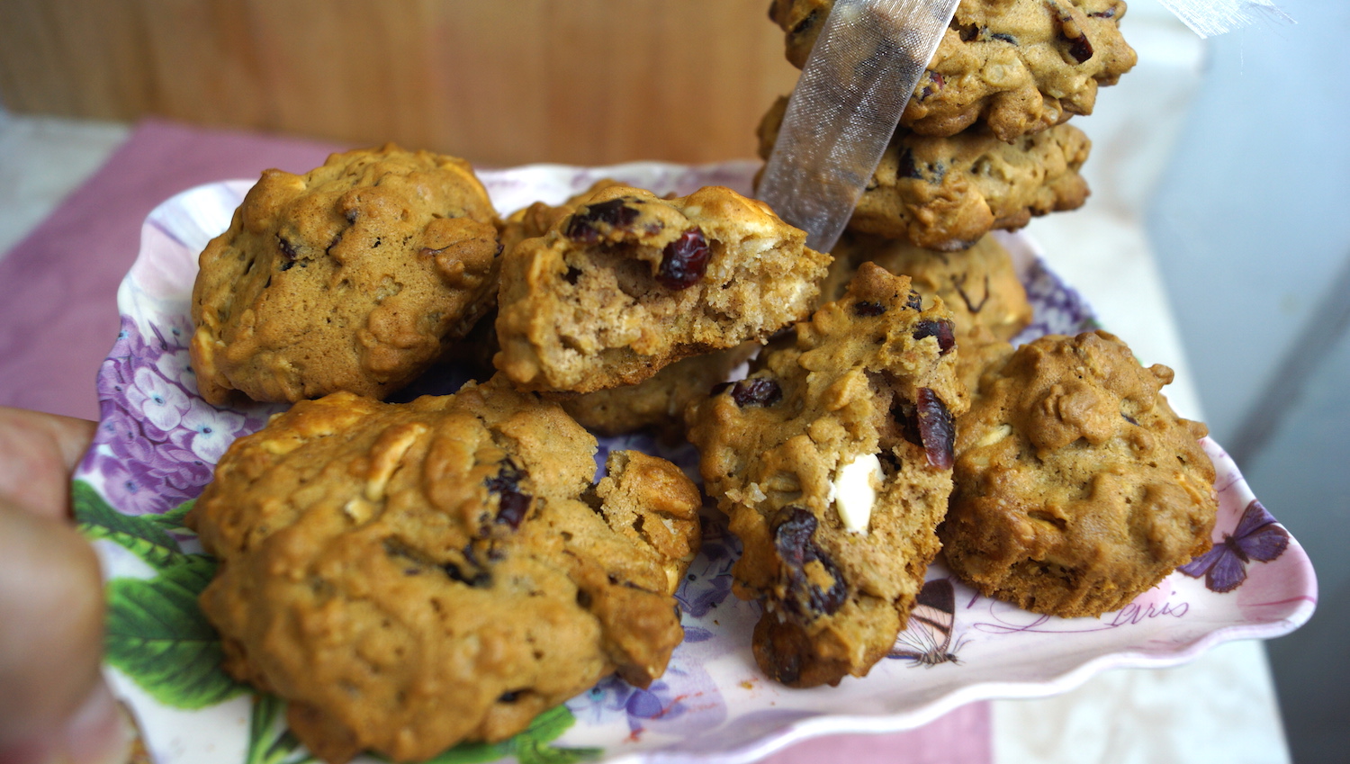 Tenía pensado hacer las galletas solamente con arándanos (cranberries) y chispas de chocolate blanco, pero ví el bote de avena y se me ocurrió ponerle también un poco, y créeme que ¡el resultado fue buenísimo!