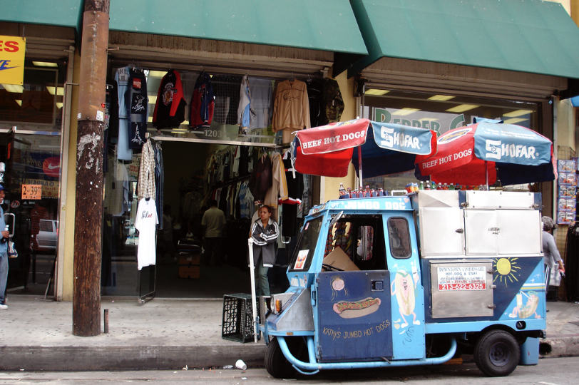 La primera vez que probé éstos hot dogs fue precisamente la primera vez que visité los callejones del centro de Los Angeles (Fashion District), de hecho ir ahí y no comer un hot dog es como ir a un concierto y taparse los oídos. Ahí en cada calle, en cada esquina hay pequeños puestos o loncheras donde venden éstos deliciosos hot dogs, refrescos y papitas.