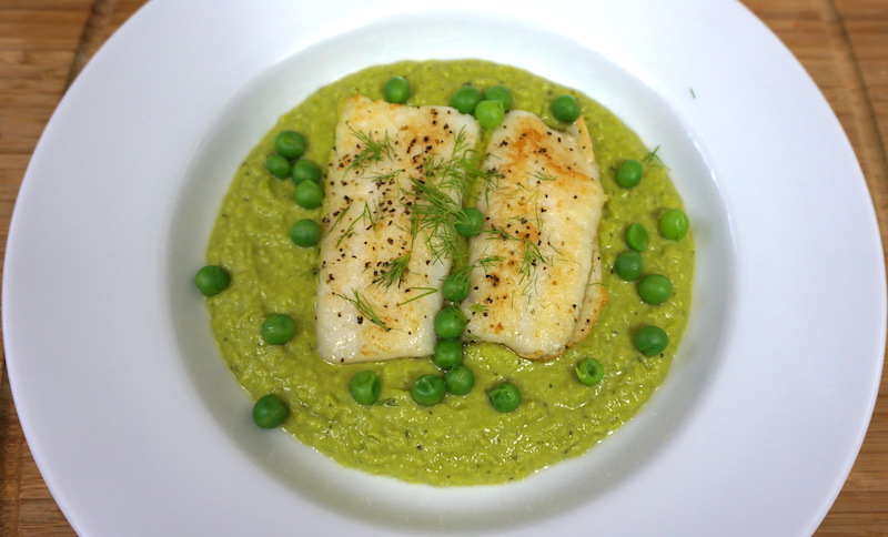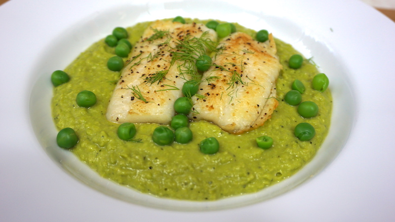 Para servir, sobre un plato coloca una cama de puré de chícharo y luego coloca el fiete de pescado. Decora el plato con chícharos y eneldo picado.