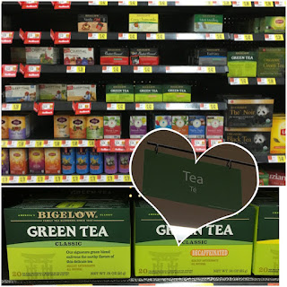 Así que tomé las llaves de mi carro y me fui a Walmart para conseguir lo que iba a ocupar para hacer una especie de kit, para hacer una cajita de regalo. Pasé por varios pasillos buscando algunas cosas básicas hasta que pasé por el pasillo de los tés, y claro no podían faltar. Agarré los que siempre compro cuando yo me enfermo: Bigelow Té Verde (uno regular y otro descafeinado) y Bigelow Té de Limón con Jengibre.