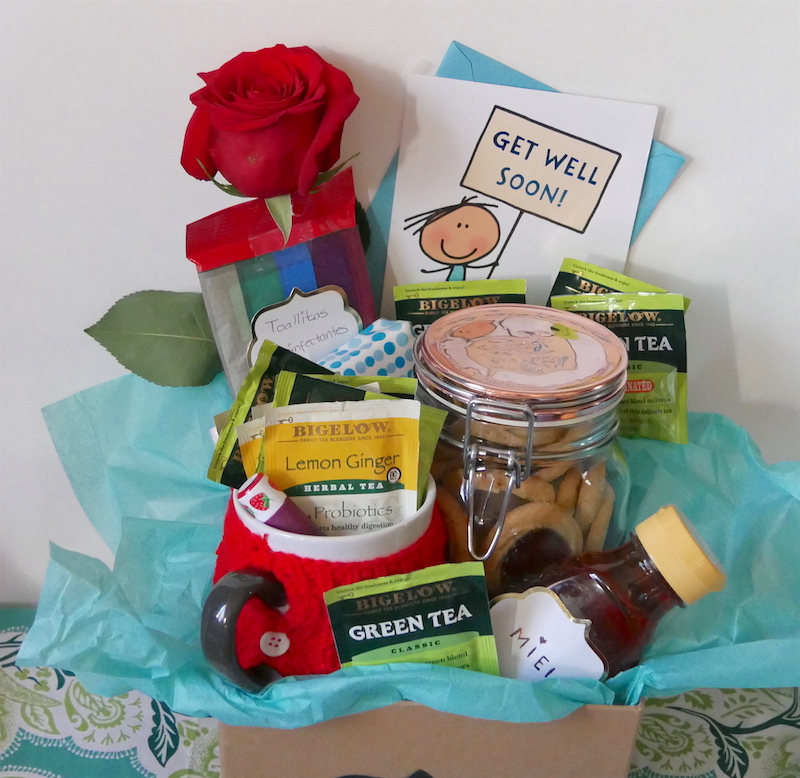 Unas galletitas para acompañar el té. Una tarjeta dónde le dije que espero y se recupere pronto. Una rosa roja, porque ¿a quién no le gustan las flores? Las flores siempre le levantan el ánimo a cualquiera.