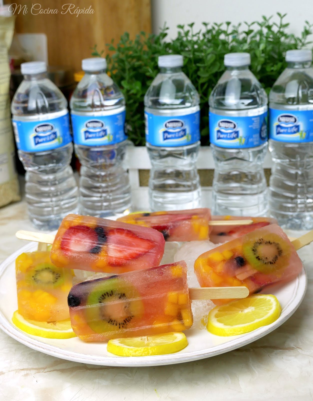 Y así quedan éstas deliciosas y refrescantes paletas de limonada con fruta.