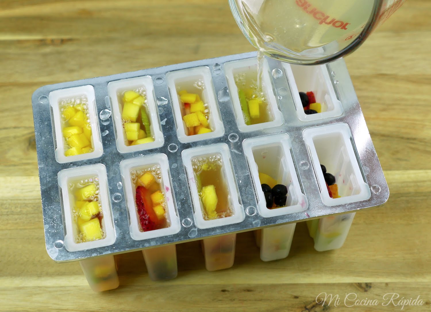 Ahora vas a colocar la fruta en los moldes para paletas. Puedes ponerle poquita o bastante fruta, todo depende de tu gusto.