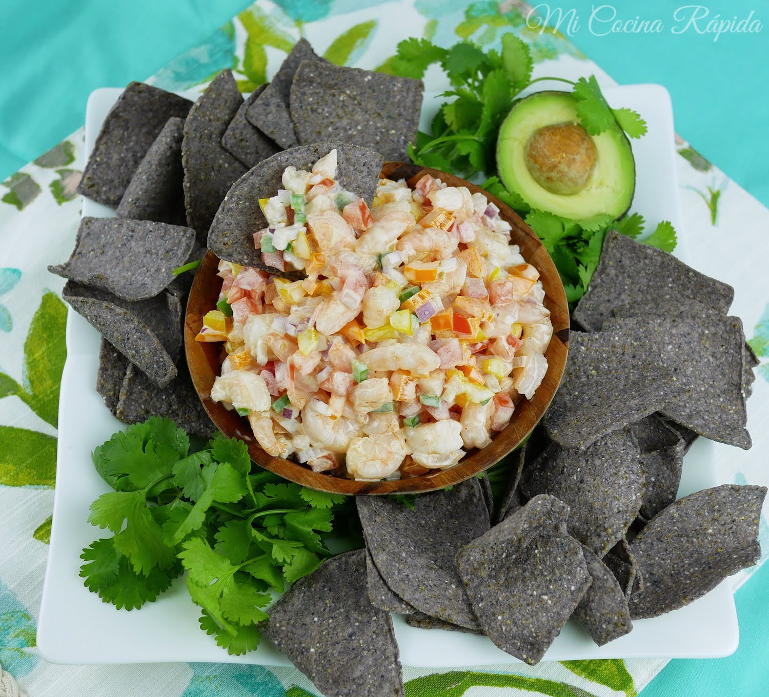 - Corta los camarones en pedazos medianos y pásalos a un plato hondo grande. Agrega los demás ingredientes y mezcla. Tápalos y deja enfriar por al menos 15 minutos.