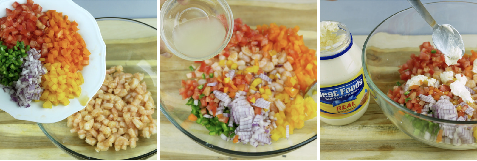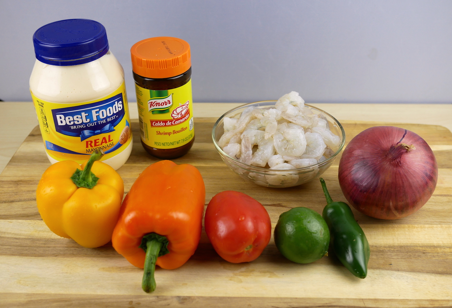 Camarones limpios, cebolla, pimiento amarillo (o rojo o naranja), jitomate, chile jalapeño y jugo de limón.