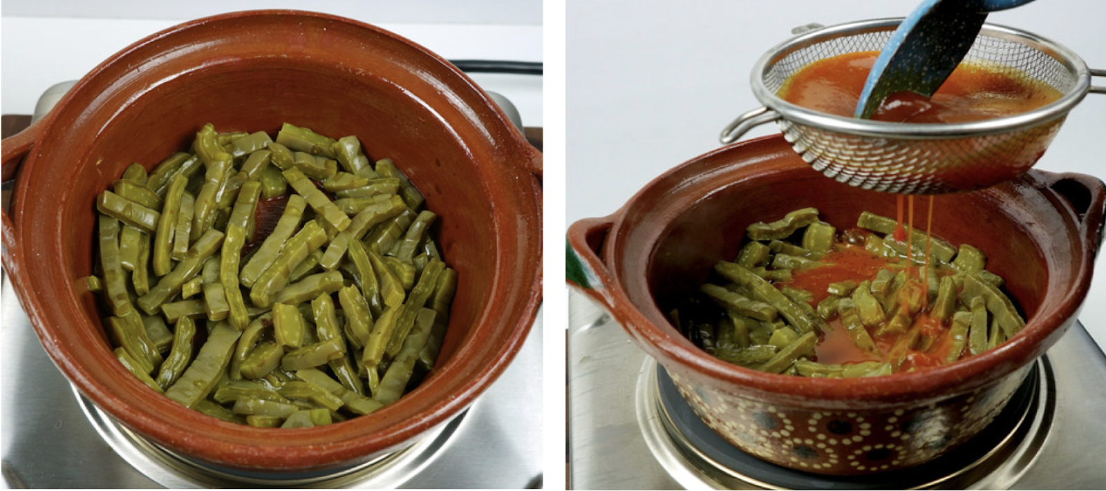 - Ahora en una cazuela pon a calentar una cucharada de aceite a fuego medio. Agrega los nopales y sofríe por unos 2 minutos. Pasa el caldillo por un colador y agrégalo a la olla.