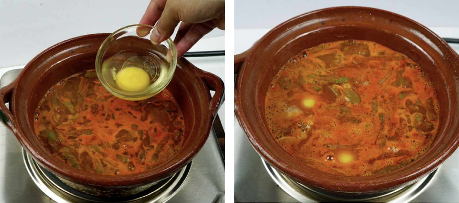 - Cuando el caldillo esté hirviendo, con mucho cuidado agrega el huevo. Tapa la olla y deja cocinando por unos minutos hasta que los huevos ya estén cocidos.