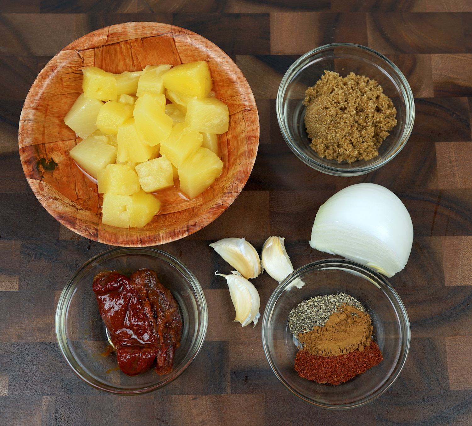 Para comenzar a preparar éste jamón primero hay que sazonarlo, para ésto hay que preparar una mezcla uy fácil con piña (yo usé de late pero puede ser fresca), azúcar morena, chiles chipotle, ajo, cebolla, paprika en polvo, canela y pimienta.