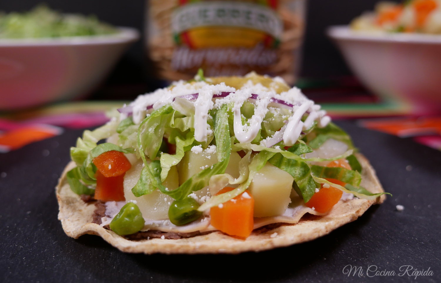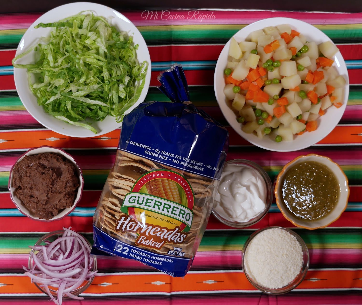 Lo que necesitas son las tostadas, frijoles refritos, jamón (de puerco o de pavo), lechuga, zanahorias, papas, chícharos, queso, crema y claro, no puede faltar la salsita picante.