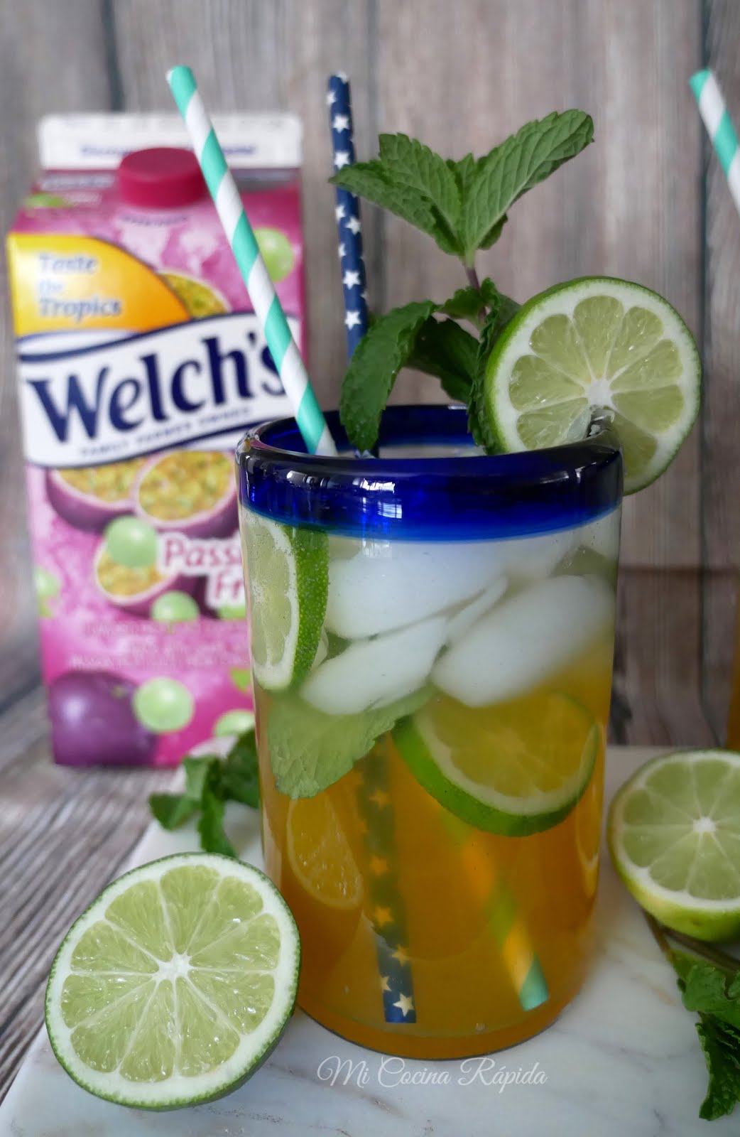 Para prepararlo sólo necesitas Welch's Passion Fruit Refrigerated Cocktail, que es la estrella de ésta bebida; también necesitarás ron, jarabe simple de azúcar (opcional), limones verdes, menta fresca, agua mineral y mucho hielo.