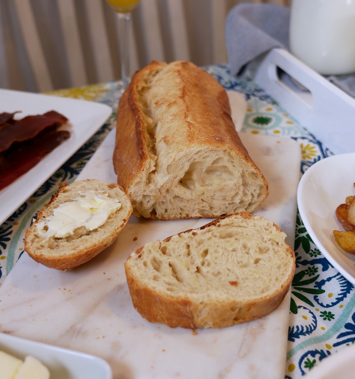 Lo serví con un pan italiano, que por cierto está buenísimo. Lo metes al horno por 14 minutos (siguiendo las instrucciones de la bolsa) y es como si lo acabaras de hacer. Y claro que la mantequilla no podía faltar con éste tipo de pan.