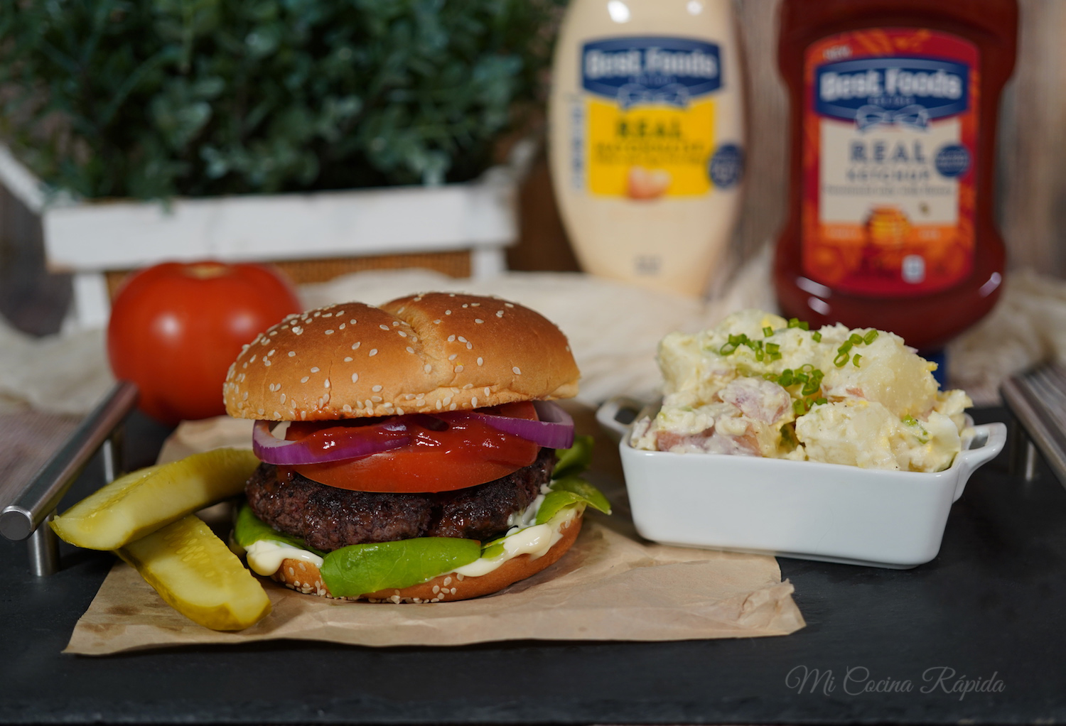 - Para formar las hamburguesas, embarra la base del pan con mayonesa, pon unas hojas de lechuga, rodajas de jitomate, la carne, Hellmann's® o Best Foods® REAL Ketchup, cebolla y la tapa del pan.