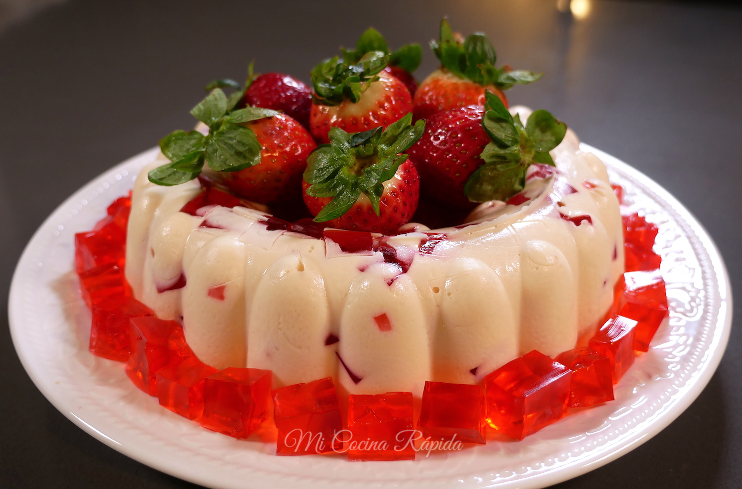 Lo que me gusta de éste tipo de postres es que los puedes hacer en muchísimas formas de presentación. Por lo regular yo la hago en un molde normal para gelatina y ya después sólo la decoro con fresas frescas. En algunas ocasiones la he preparado en vasitos plásticos transparentes para llevar a las reuniones, que por cierto, siempre se terminan rapidísimo.