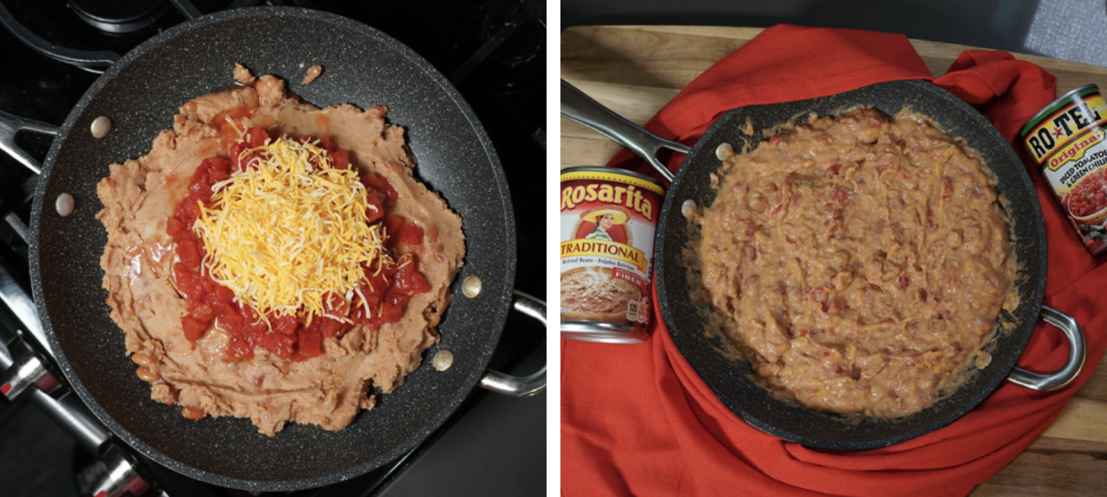 - En un sartén coloca Rosarita Traditional Refriend Beans, RO*TEL Original Diced Tomatoes and Green Chillies y el queso. Calienta a fuego medio por unos 5 minutos o hasta que el queso se derrita completamente. Sazona con sal y pimienta. Reserva a un lado.