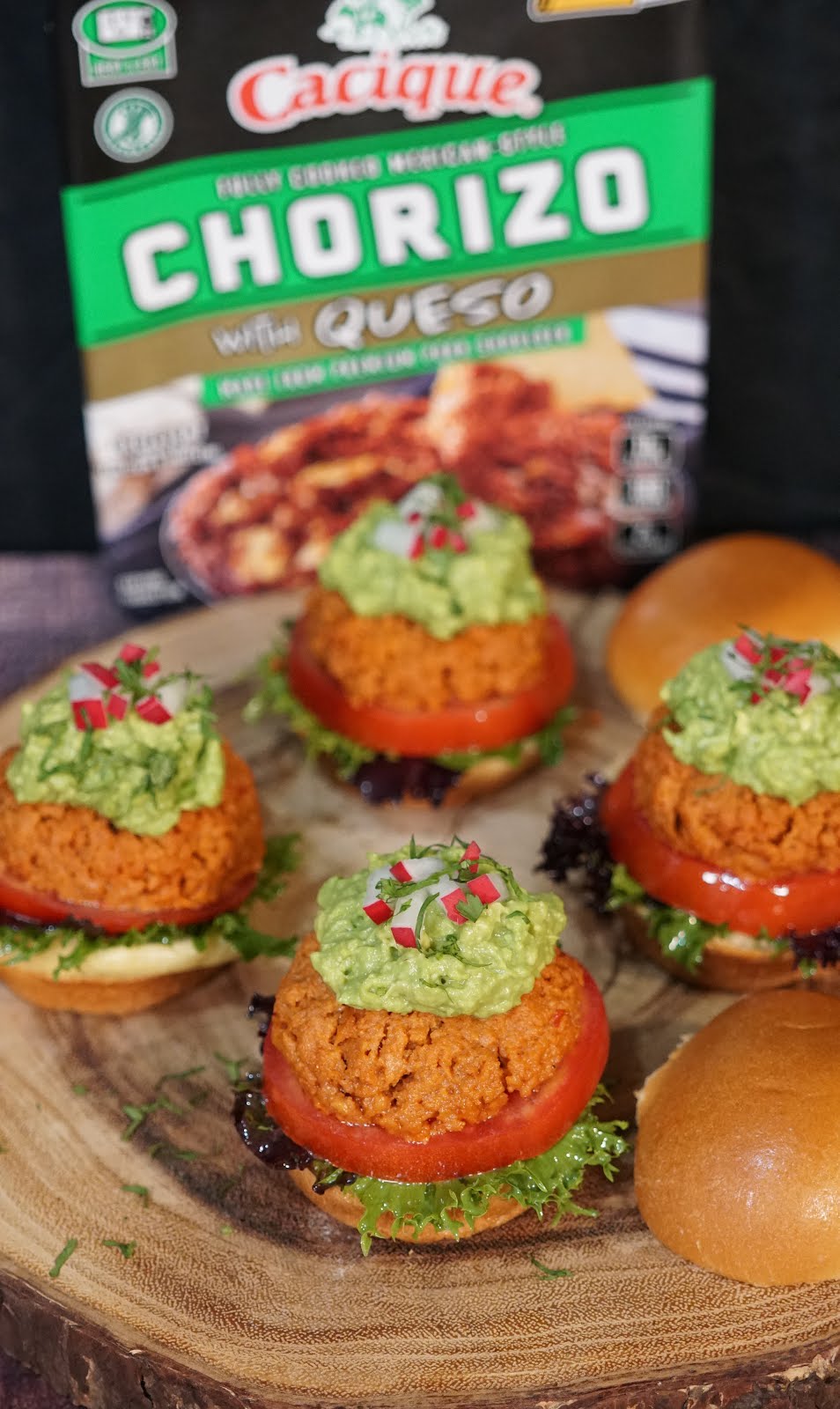 Unas deliciosas Mini Hamburguesas de Chorizo con Queso con un toque de Guacamole, perfectas para esas tardes/noches de juego. Te aseguro que tus invitados quedarán encantados.