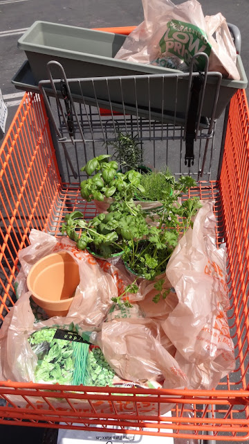 Después de un buen rato, salí con todo lo que ocupaba. Compre 4 macetas de terracota de 6”, 1 maceta larga de 24”, 1 bolsa de tierra orgánica, 1 bolsa de alimento para plantas, 3 paquetitos de semillas (cebollines, perejil y eneldo), 5 hierbas ya crecidas (2x albahaca, perejil, cebollines y romero) y un kit completo para crecer hierbas en casa. Por cierto déjame te digo que los precios estaban bien, muy buenas ofertas.